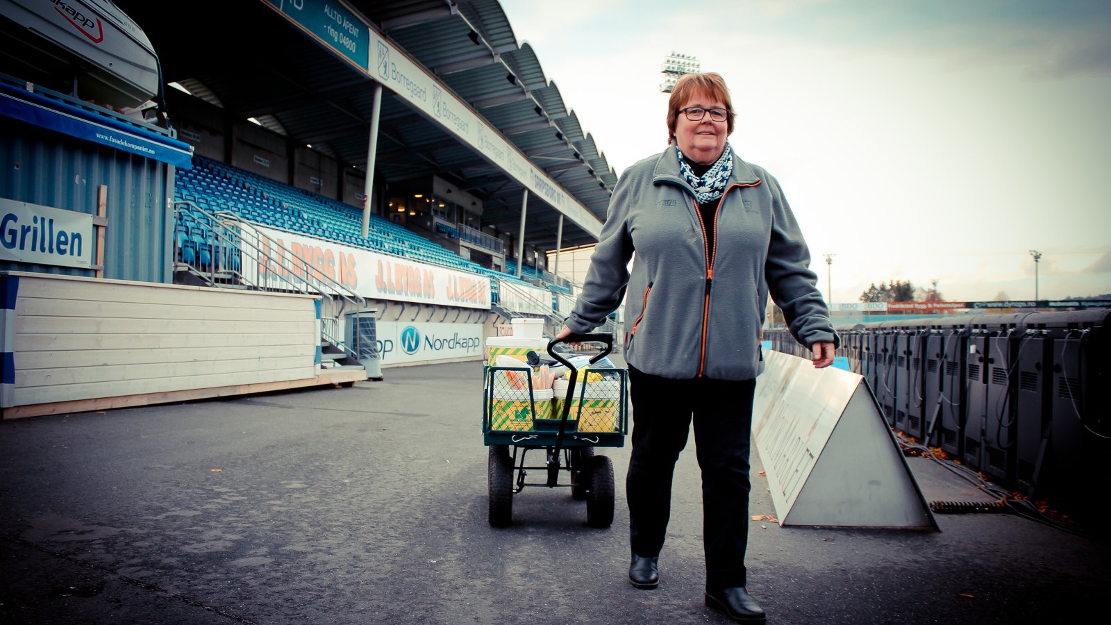 Nærmest daglig går de rundt – i midtgangen, i kiosken bak mål eller i kioskene på sidene av tribunene. Berit og den grønne tralla.